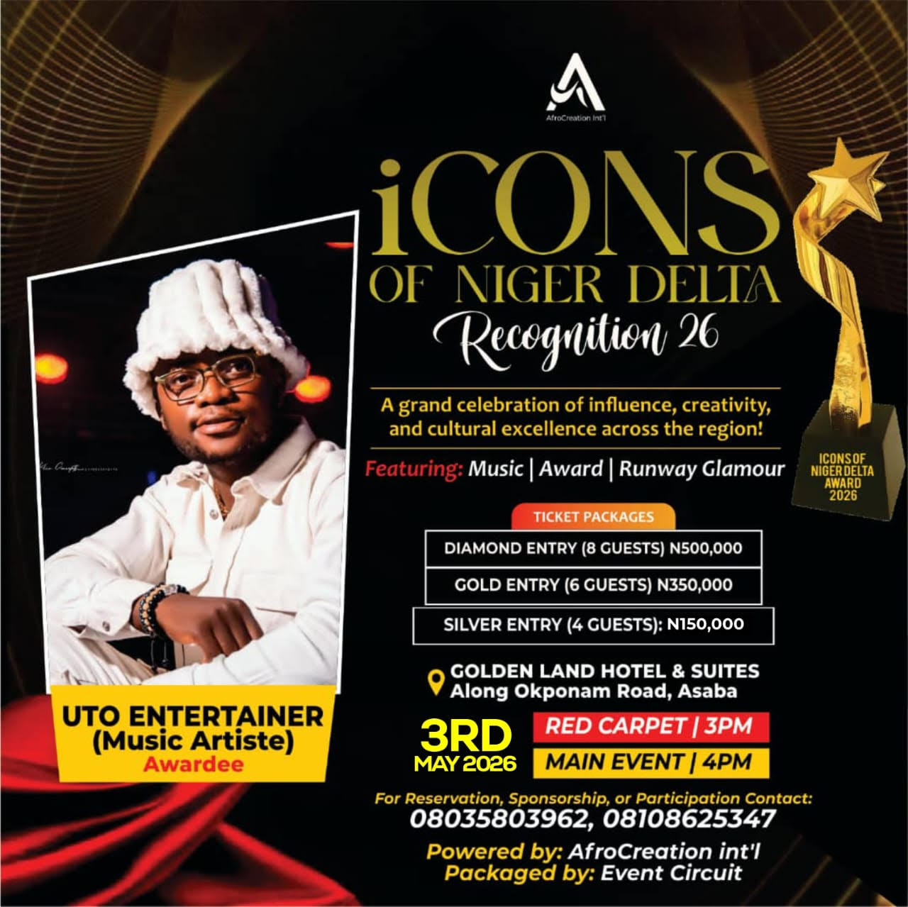 Uto Entertainer, one of the Niger Delta’s most dynamic music artistes, has been officially nominated for Artist of the Year at the Icons of Niger Delta Recognition 26, powered by AfroCreation Int’l and packaged by Event Circuit.